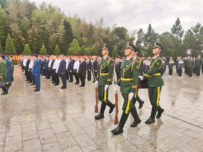 之后,《思念曲》再次低回奏響,兩名禮兵抬烈士棺槨禮步行進(jìn)至烈士墓穴,將棺槨緩緩入土安葬,全場人員行注目禮。黃公略烈士安葬后,18名禮兵將9個花籃擺放至烈士墓碑前,在場人員依次獻(xiàn)花致敬,并瞻仰紀(jì)念墻。儀式結(jié)束后,禮兵將棺槨上覆蓋的國旗交給烈士家屬,以示尊崇和榮光。