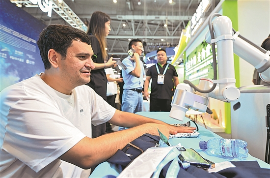 日前,在浙江杭州,外國觀眾體驗機器人艾灸。當(dāng)日,在第三屆全球數(shù)字貿(mào)易博覽會現(xiàn)場,展出的中醫(yī)機器人吸引觀眾體驗。王剛 攝/中新社