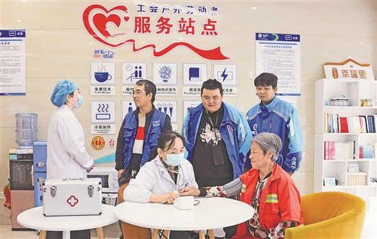 10月8日,浙江省臺州市仙居縣安洲街道社區(qū)衛(wèi)生服務(wù)中心醫(yī)務(wù)人員在城區(qū)一工會驛站為戶外勞動者測量血壓。當(dāng)日,該中心在城區(qū)工會驛站開展“預(yù)防高血壓”義診活動,醫(yī)務(wù)人員為環(huán)衛(wèi)工人等戶外勞動者測量血壓,發(fā)放預(yù)防高血壓病宣傳資料,普及高血壓防治知識。