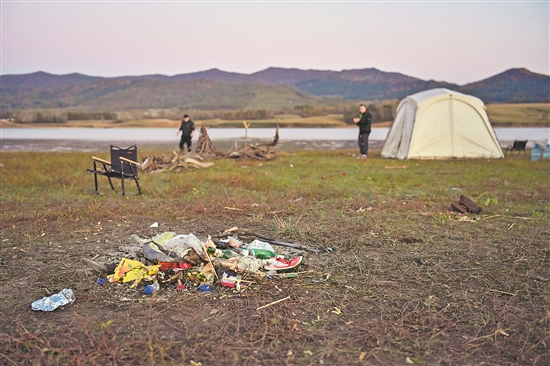 在吉林省吉林市松花湖岸邊,露營愛好者在搭建帳篷,垃圾散落在附近(10月2日攝)。