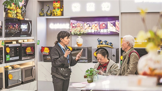 銷售人員在向市民推介以舊換新商品。