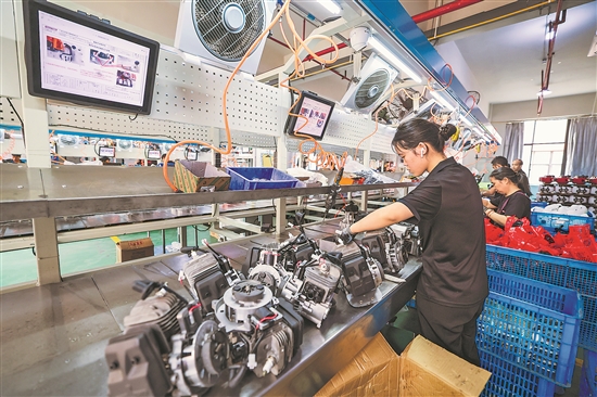 日前,在位于金華市的浙江托馬斯工具制造有限公司數(shù)字化車間內(nèi),工人在流水線上生產(chǎn)出口的園林機(jī)械。