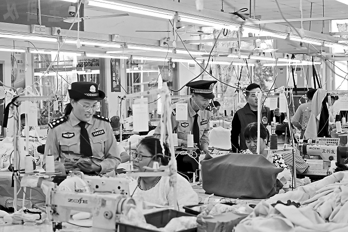 10月14日,江蘇省寶應(yīng)縣公安局城北派出所民警向企業(yè)員工宣講安全生產(chǎn)知識(shí)及預(yù)防電信網(wǎng)絡(luò)詐騙常識(shí),助力營(yíng)商環(huán)境優(yōu)化提升。本報(bào)通訊員 沈冬兵 攝