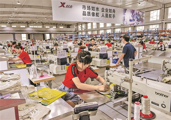 在特步集團(tuán)的智能運(yùn)動鞋生產(chǎn)線上,工人們在趕制出口訂單。