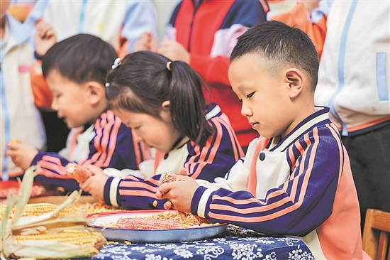 10月16日,在山東省青島市李滄區(qū)青峰路幼兒園,小朋友參加搓玉米比賽。當(dāng)日是世界糧食日,各地開展主題教育活動(dòng),增強(qiáng)孩子們愛惜糧食、節(jié)約糧食的意識(shí)。新華社發(fā)(張鷹 攝)