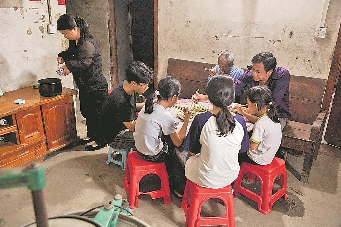 10月15日,忙碌了一天的郭石芳回家后與家人們一起吃晚飯。