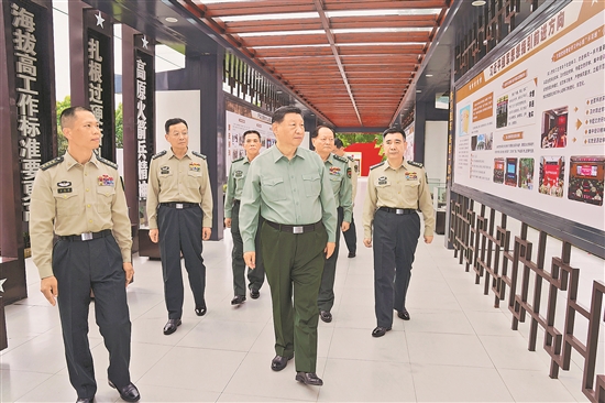 金秋十月,江淮大地山水秀麗、風(fēng)景如畫。上午11時許,習(xí)近平來到火箭軍某旅,首先察看了該旅軍史長廊。該旅是一支有著50多年光榮歷史的戰(zhàn)略導(dǎo)彈部隊。黨的十八大以來,該旅在習(xí)近平強(qiáng)軍思想指引下,堅定舉旗鑄魂,大抓實戰(zhàn)化訓(xùn)練,出色完成一系列重大任務(wù)。在反映部隊發(fā)展歷程、新時代全面建設(shè)的展板前,習(xí)近平詳細(xì)了解官兵學(xué)習(xí)黨的創(chuàng)新理論、加緊練兵備戰(zhàn)、弘揚(yáng)優(yōu)良傳統(tǒng)等情況。