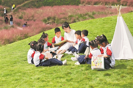 正逢粉黛亂子草盛開的時節(jié),圖為孩子們在優(yōu)美的自然環(huán)境中,和老師一起讀書。