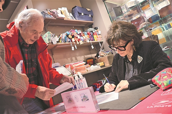 近日,在法國(guó)巴黎舉行的《中法建交六十周年》紀(jì)念郵票首發(fā)儀式現(xiàn)場(chǎng),郵票設(shè)計(jì)者之一、法國(guó)藝術(shù)家桑德里娜·尚博為集郵愛(ài)好者簽名。新華社記者 張百慧 攝