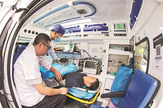 該院利用5G+物聯(lián)網技術,采集現(xiàn)運行救護車危重病人心電圖、生命體征、救治圖像與醫(yī)院急診系統(tǒng)五大中心對接,做到“上車即入院”。翟慧勇 攝/視覺中國