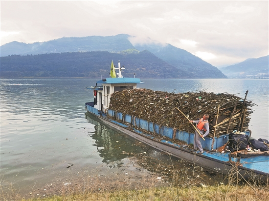 10月17日,重慶云陽縣濱江公園附近的長江上,59歲的何師傅正在打撈江面上的漂浮物,主要是樹枝、秸稈,還有少量的塑料瓶、塑料袋等垃圾。在長江邊出生的他原來是漁民,19年前加入了清漂隊。雖然辛苦,但終日與綠水青山相伴,也別有一份自在和愜意。本報記者 蔣菡 攝