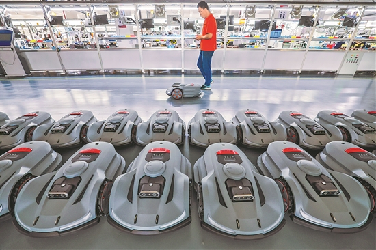 10月23日,在位于金華市金義新區(qū)的浙江白馬科技有限公司車間里,工作人員測試智能割草機(jī)器人。浙江白馬科技有限公司是國內(nèi)規(guī)模較大的園林設(shè)備生產(chǎn)商,產(chǎn)品以出口為主。