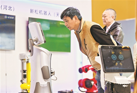 10月25日,在2024京津冀產(chǎn)業(yè)鏈供應(yīng)鏈大會(huì)開幕式會(huì)場(chǎng)外設(shè)置的企業(yè)推介展區(qū),與會(huì)嘉賓與一款服務(wù)機(jī)器人互動(dòng)。