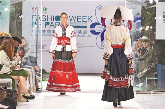 近日,來(lái)自中國(guó)云南的楚雄彝族服飾非遺時(shí)裝展在法國(guó)巴黎舉行,這項(xiàng)有著1700多年歷史的國(guó)家級(jí)非遺再次亮相國(guó)際主流的時(shí)裝舞臺(tái)。今年是中法建交60周年,2024巴黎時(shí)裝周·中國(guó)楚雄非遺服飾時(shí)裝展是慶祝中法建交60周年系列活動(dòng)之一。圖為近日,模特在法國(guó)巴黎舉行的中國(guó)楚雄非遺服飾時(shí)裝展上展示時(shí)裝。