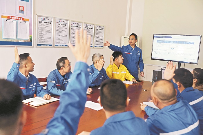 中國能建易普力公司定期組織班組討論會,讓一線職工在進(jìn)行各類技能培訓(xùn)和業(yè)務(wù)學(xué)習(xí)的同時,也積極提出合理化建議,共同解決生產(chǎn)過程中的問題。圖為10月22日,該公司的一家工廠內(nèi),職工正在召開班組討論會。本報記者 王偉偉 攝