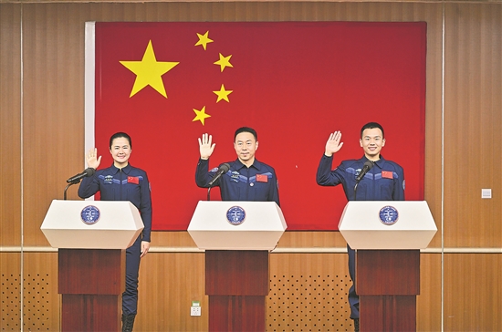10月29日,神舟十九號載人飛行任務(wù)航天員蔡旭哲(中)、宋令東(右)、王浩澤在酒泉衛(wèi)星發(fā)射中心問天閣與媒體記者集體見面。新華社記者 李鑫 攝