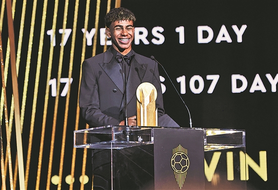 當日,摘得象征最佳年輕球員“科帕獎”的西班牙球員亞馬爾在頒獎典禮上。新華社記者 高靜 攝