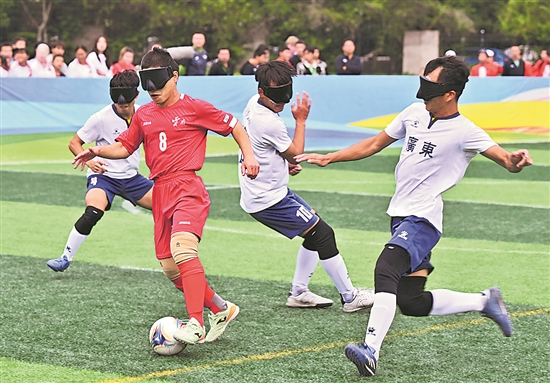 10月28日,2024年全國盲人足球錦標賽在福建省福州市殘疾人體育運動管理中心落幕。在男子組決賽中,云南隊2比0戰(zhàn)勝廣東隊,獲得冠軍。圖為云南隊球員李玉(左二)在比賽中帶球突破。新華社記者 姜克紅 攝