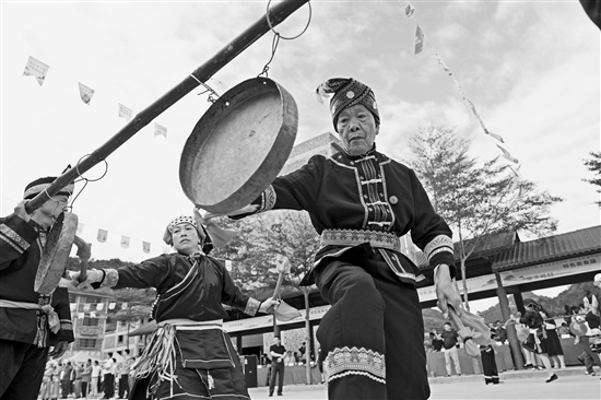 阮桂陸(前右)在田東縣作登瑤族鄉(xiāng)表演(10月23日攝)。