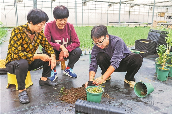 10月31日,在銀湖街道唐家塢村禾美農(nóng)旅融合式的共富工坊內(nèi),95后農(nóng)創(chuàng)客汪雷(右一)指導(dǎo)村民進行盆栽移苗。該共富工坊擁有近3000平方米高標(biāo)準(zhǔn)苗圃,主要培育國外進口的觀賞性植物盆栽,幫助10余名村民實現(xiàn)“家門口”就業(yè)。