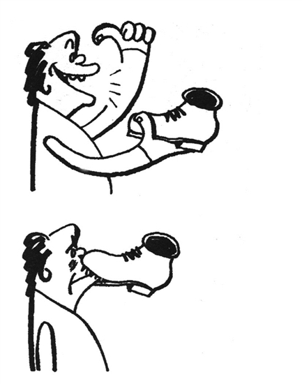 “名鞋”剛剛與名腳“牽手成功”,便得意忘形、肆無忌憚,以至開口大笑、皮開肉綻。名腳畢竟不是普普通通的“角兒”,何以咽得下這口悶氣,二話不說便以最快的速度把鞋子甩向名嘴。名嘴還想施展口才,怎奈被那只破口(說不定還想大罵)的鞋子緊緊“咬”住嘴。名嘴推銷劣質(zhì)產(chǎn)品,被投訴,被處理,因而信譽(yù)掃地、進(jìn)而失去施展口才的機(jī)會(huì),當(dāng)下人們對(duì)這情境有種形象的描述,叫作“翻車”,也有人稱之為“打臉”,可見,“夾嘴”是“打臉”的升級(jí)版本。