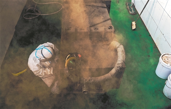 刺鼻的氣味、腐蝕性的液體,讓他人避之不及,而他們會毫不猶豫地將雙手伸進裝滿除銹劑的盆里,用鋼刷除去設(shè)備配件上的斑斑銹跡。即使戴著手套,有時也會被除銹劑浸透,無情地侵蝕著他們的皮膚。長時間下來,雙手會嚴重脫皮、發(fā)炎,那紅腫的雙手令人心疼。