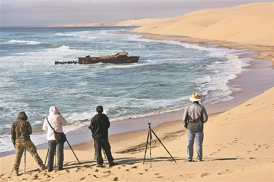 納米布-諾克盧福國家公園位于納米比亞西南部的大西洋沿岸,擁有多個(gè)知名景點(diǎn),深受游客喜愛。這是近日在納米比亞納米布-諾克盧福國家公園內(nèi)的一處船只殘骸景點(diǎn),游客拍照留念。 新華社記者 陳誠 攝