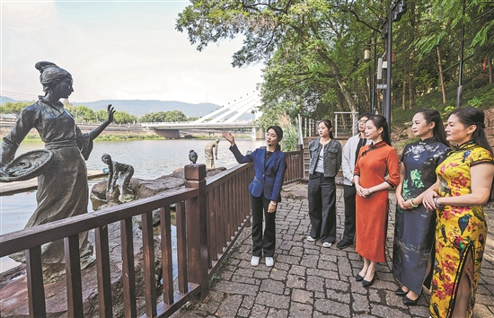 11月12日,在浙江省諸暨市西施故里景區(qū),“金牌推薦官”導游(左一)在給游客介紹西施浣紗雕像。