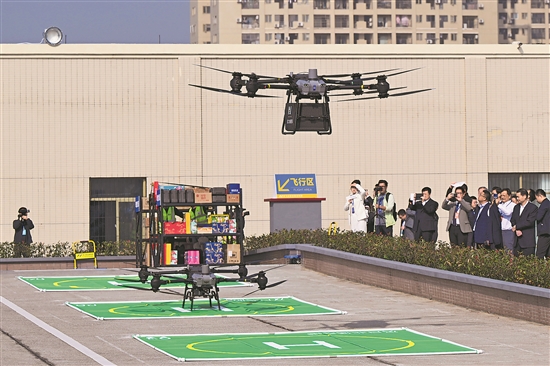 11月12日,裝配快遞盒的無人機(jī)在漢口北低空港無人機(jī)停機(jī)坪起飛。