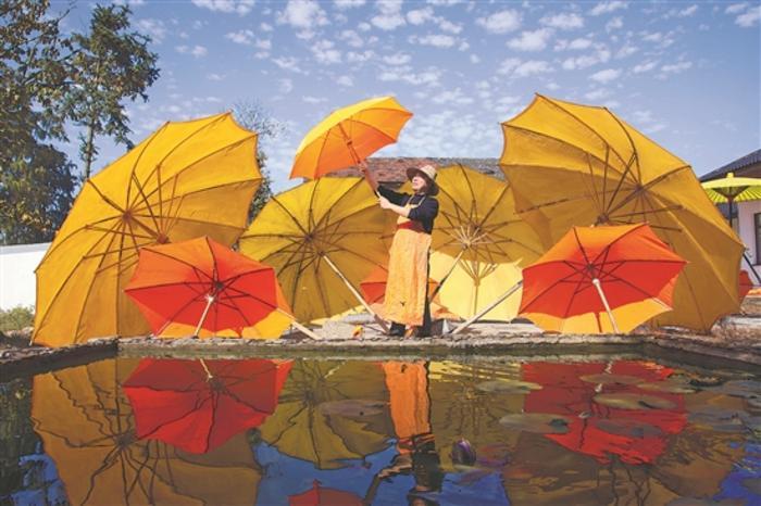 11月13日,在安徽省宣城市涇縣昌橋鄉(xiāng)孤峰村,國(guó)民油布傘廠的工人在晾曬油布傘。