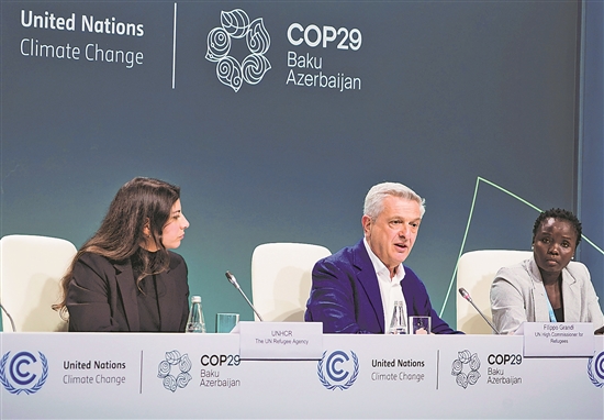 圖為當(dāng)?shù)貢r(shí)間11月12日,在阿塞拜疆首都巴庫,聯(lián)合國難民署高級(jí)專員菲利波·格蘭迪(中)出席新聞發(fā)布會(huì)。