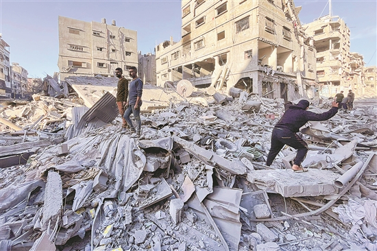 當?shù)貢r間11月17日,在加沙地帶北部城鎮(zhèn)拜特拉希亞,人們聚集在一幢遭襲房屋的廢墟附近。