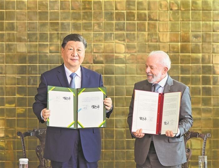 我們就中巴關(guān)系未來發(fā)展達(dá)成新的戰(zhàn)略共識,其中最重要的是,我們共同決定將雙邊關(guān)系提升為攜手構(gòu)建更公正世界和更可持續(xù)星球的中巴命運(yùn)共同體,同時將共建“一帶一路”倡議同巴西發(fā)展戰(zhàn)略對接。在世界格局加速演變的背景下,這體現(xiàn)了中巴兩個發(fā)展中大國識變、應(yīng)變、求變的決心,必將推動兩國關(guān)系繼往開來、開啟下一個“黃金50年”,同時為全球南方國家團(tuán)結(jié)自強(qiáng)樹立榜樣,為提升發(fā)展中國家在全球治理中的代表性和發(fā)言權(quán)作出新的貢獻(xiàn)。