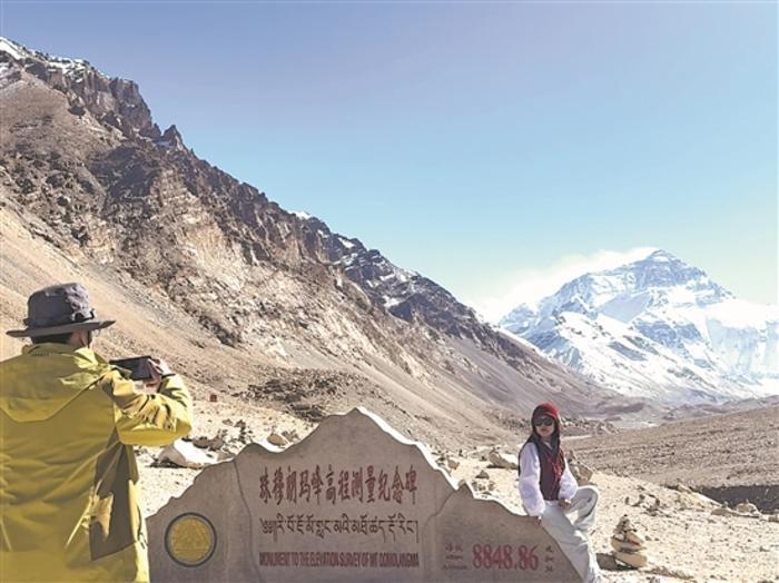 11月20日,游客在珠峰景區(qū)拍照留影。