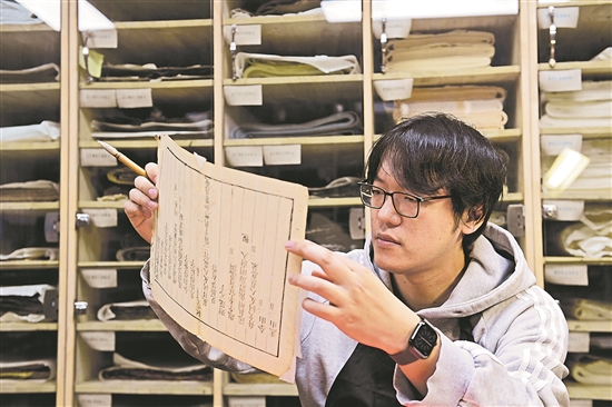 11月18日,在浙江寧波的天一閣文物修復(fù)中心,謝龍龍查看書葉修補(bǔ)情況。