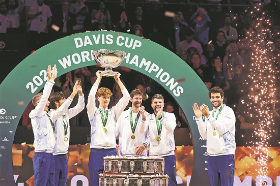2024戴維斯杯男子網球團體賽決賽近日在西班牙馬拉加舉行,意大利隊在男單世界第一辛納的帶領下,以2比0戰(zhàn)勝荷蘭隊,連續(xù)第二年捧杯。在此前進行的2024比利·簡·金杯女子網球團體賽決賽中,意大利隊以總比分2比0戰(zhàn)勝斯洛伐克隊,獲得冠軍。這也意味著意大利隊包攬了本賽季男女兩項國家隊賽事的冠軍。