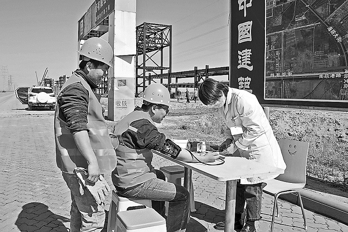 圖為建筑工人在醫(yī)護(hù)人員幫助下使用流動(dòng)簡(jiǎn)易醫(yī)療箱監(jiān)測(cè)血壓,保證健康上崗。本報(bào)通訊員 紀(jì)永奇 攝