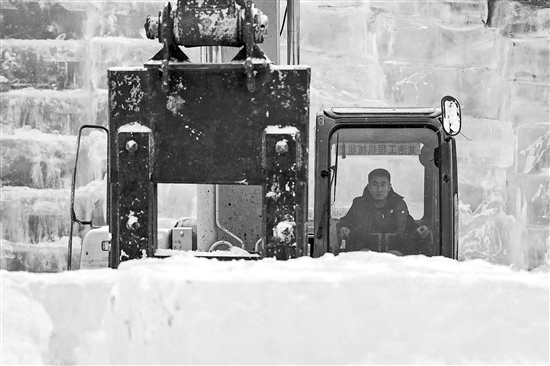 11月26日,在哈爾濱冰雪大世界存冰場,工人將冰塊裝車。