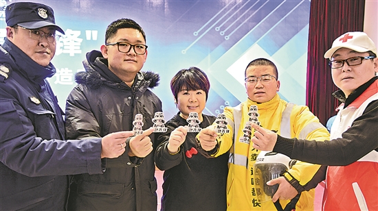 11月28日,望京街道應(yīng)急救援隊的志愿者展示他們的“望京急先鋒”標(biāo)牌。