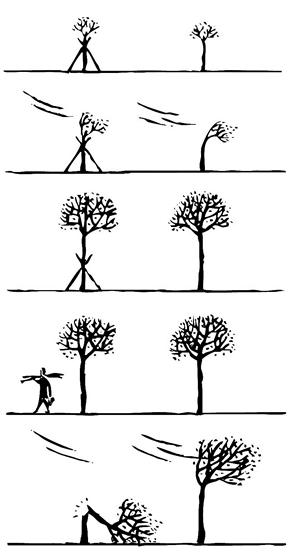 或許是“親生”的,或許疼愛(ài)里還有溺愛(ài),被偏愛(ài)支撐的小樹,無(wú)疑是被保護(hù)的重點(diǎn)。風(fēng)雨來(lái)了,小樹左比小樹右少了幾分憂慮,它不必?fù)?dān)心被刮倒,甚至不擔(dān)心身體傾斜。小樹右經(jīng)歷了無(wú)數(shù)次搖擺,最終還是站得筆直。