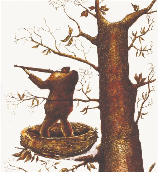 “鳩占鵲巢”的獵人仍不歇手追殺可憐的鳥兒。樂極生悲的事兒找上門來了——貪婪射手占據(jù)的大樹正在斷裂,其后果可想而知。