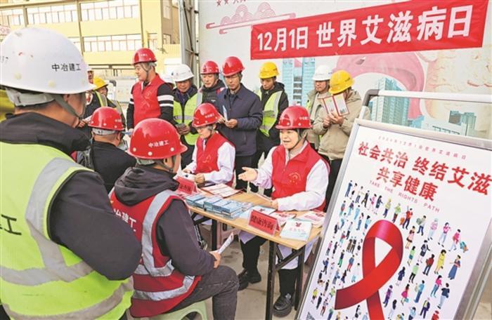 12月1日是第37個(gè)世界艾滋病日,在山東省棗莊市光明路街道一處建筑工地,醫(yī)務(wù)志愿者向建筑工人宣講艾滋病防治知識(shí)。各地開展主題宣傳活動(dòng),增強(qiáng)人們對(duì)艾滋病防治知識(shí)的了解。 新華社發(fā) (孫中喆 攝)