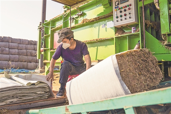 12月1日,在南縣浪拔湖鎮(zhèn)太陽(yáng)山村一秸稈飼料化利用工廠,工人將秸稈制作成飼料。
