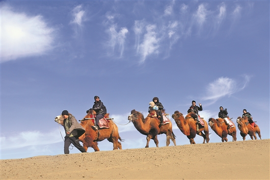 12月1日,游客在甘肅省敦煌市鳴沙山月牙泉景區(qū)騎駱駝游覽。