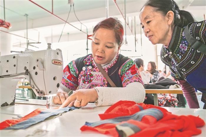 12月1日,元陽(yáng)縣德熙紡織廠(chǎng)成品生產(chǎn)車(chē)間組長(zhǎng)刀秀瓊(左)在由當(dāng)?shù)亻e置停車(chē)場(chǎng)改造的生產(chǎn)車(chē)間里指導(dǎo)新員工工作。