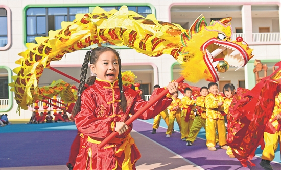 浙江省臺州市仙居縣迎暉幼兒園的小朋友在表演舞龍,喜迎龍年新春(2024年1月18日攝)。