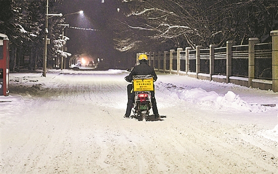 近日,黑龍江多地迎來暴雪天氣,氣溫大幅降低。11月27日晚,記者在齊齊哈爾街頭看到,一位正在送餐的外賣小哥因地面積雪,車轱轆不時(shí)打滑。雪天道路濕滑,請(qǐng)外賣小哥小心慢行,注意安全,也請(qǐng)顧客給他們多一些時(shí)間。(本報(bào)記者 曹玥 史宏宇)