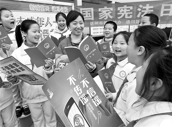 12月3日,在四川省達(dá)州市通川區(qū)羅江鎮(zhèn)魏興實(shí)驗(yàn)學(xué)校,普法志愿者給學(xué)生講解憲法知識。今年12月4日是第十一個國家憲法日,各地開展形式多樣的活動普及憲法知識,宣傳法治觀念。