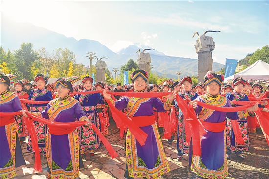 圖為11月1日,在四川省茂縣中國(guó)古羌城,當(dāng)?shù)厍甲迦罕娸d歌載舞慶祝羌年。新華社發(fā) (何清海 攝)