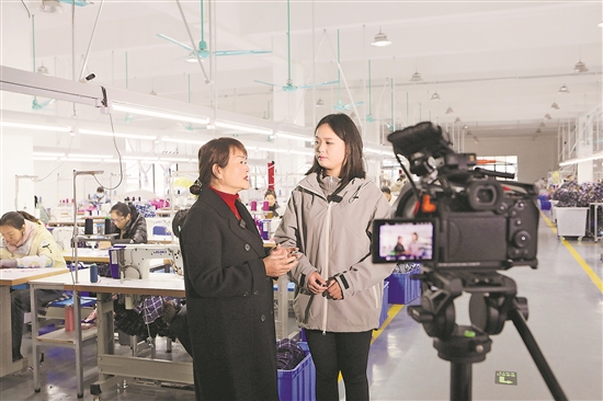 12月5日,在貴州省黔東南苗族侗族自治州施秉縣一家服裝企業(yè)生產(chǎn)車間,直播人員(右)和人社部門工作人員在線上向求職者介紹崗位信息。
